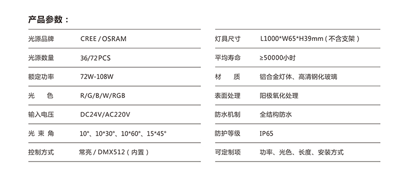 材质:灯体为6063-T5AA铝合金挤出成型,304不锈钢螺栓紧固,铝合金压铸端盖